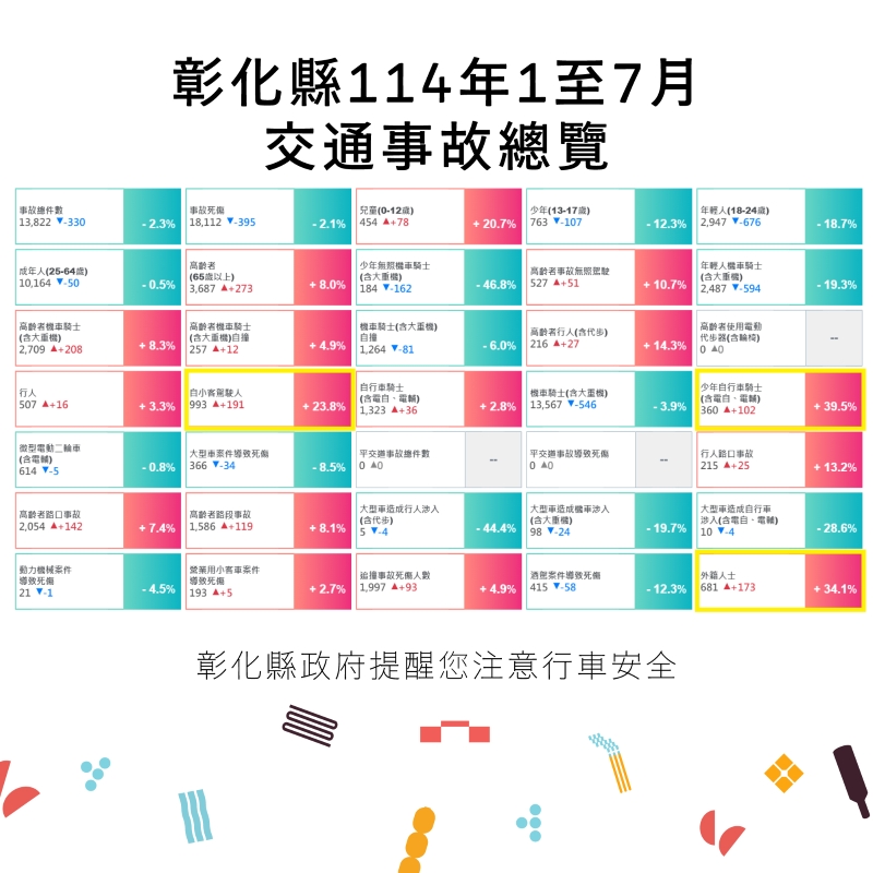 附件為「114年1-7月全國道路交通事故統計、彰化縣交通事故總覽、本縣各鄉鎮市每千人死傷人數及肇事熱點」共4份統計資料宣導圖,社群宣導內容可參閱或分享本處「花現彰化-2025台灣設計展」(https://www.facebook.com/chcginformation)臉書粉絲專頁。